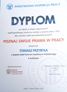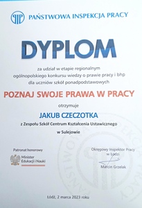 Uczniowie Branżowej Szkoły I stopnia uczestniczyli w konkursie pt.: ,,Poznaj swoje prawa w pracy". Do finału eliminacji na etapie regionalnym przystąpilo 66 uczestników że szkół ponadpodstawowych. Celem konkursu zorganizowanego przez Państwą Inspekcję Pracy jest popularyzowanie wśród uczniów szkół ponadpodstawowych wiedzy dotyczącej ochrony pracy, bezpieczeństwa i higieny pracy, legalności zatrudnienia oraz innej pracy zarobkowe. Uczestnicy otrzymali gratulacje i dyplom uznania za nabytą wiedzę, która naprawdę przyda się w przyszłym życiu zawodowym.