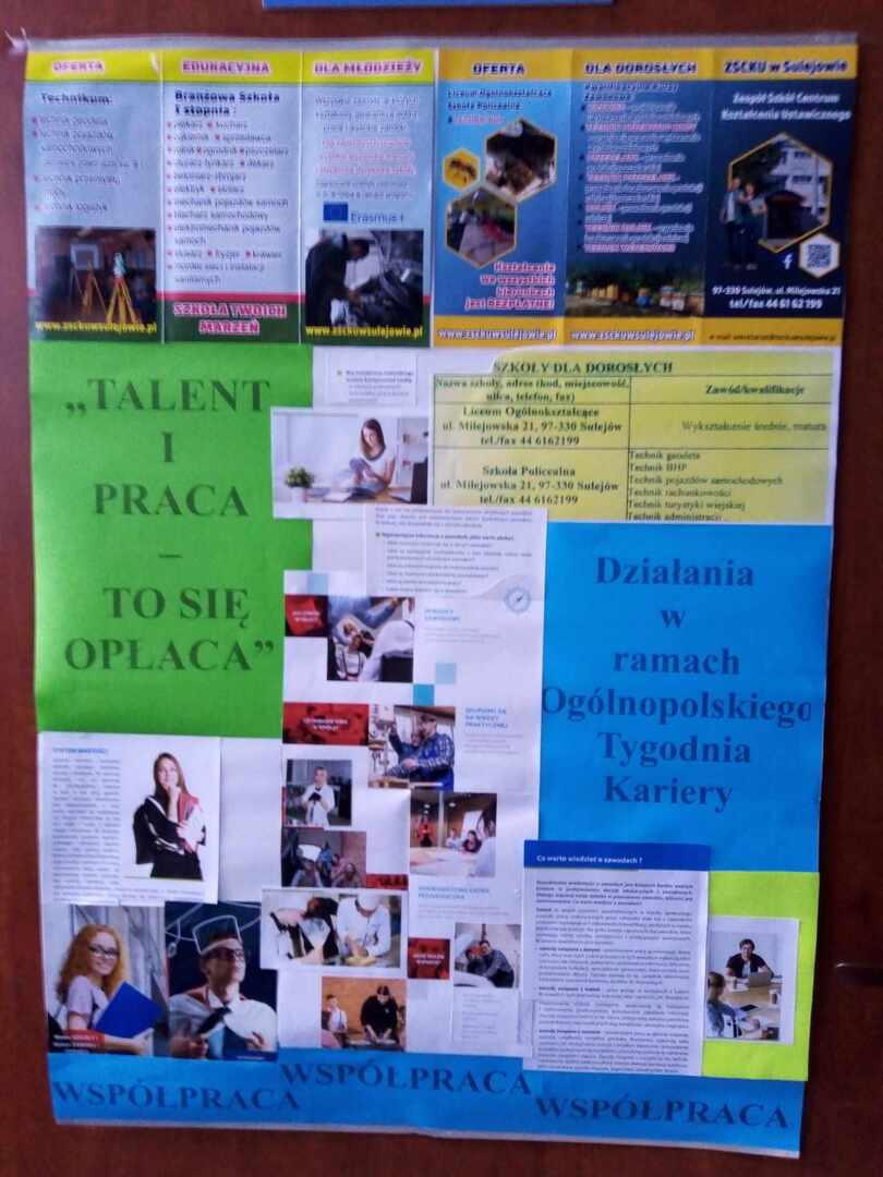 To już kolejna XV edycja OTK wpisująca się w zainicjowaną akcję przez Stowarzyszenie Doradców Szkolnych i Zawodowych RP.. 17 października 2023 r. w Naszej Szkole ruszyła coroczna akcja Ogólnopolskiego Tygodnia Kariery w ramach kolejnej edycji mającej na celu inicjowanie lokalnych inicjatyw i działań na rzecz rozwoju poradnictwa zawodowego. W tym roku w ramach konkursu wytypowano hasło: ,, TALENT I PRACA - TO SIĘ OPŁACA". Spotkanie poprzedzające warsztaty dla młodzieży inspirujące do odkrywania talentu, poprzez angażowanie do próbowanie różnych czynności wpisujących się w kształtowanie umiejętności, zainaugurowane zostało przez Panią Wieslawę Olejnik - dyrektor ZSCKU w SULEJOWIE . Następnie Pani Iwona Przewoźnik doradca zawodowy wprowadziła uczestników spotkania w harmonogram zorganizowanego przedsięwzięcia skierowanego do lokalnej SPOŁECZNOŚCI ZE SZKÓŁ PODSTAWOWYCH i SPOŁECZNOŚCI Z NASZEJ SZKOŁY. Zagadnienia znaczenia w życiu człowieka TALENTU i PRACY przybliżyła Pani Ewa Mrozinską doradcą zawodowym z CENTRUM INFORMACJI I PLANOWANIA KARIERY ZAWODOWEJ WUP w Piotrkowie Trybunalskim . Następnie młodzież z podziałem na 15 osobowe grupy rozpoczęła warsztat z Panią Katarzyną Wojciechowską - doradca zawodowy CENTRUM EDUKACJI I PRACY MŁODZIEŻY OHP w Piotrkowie Trybunalskim. Zapraszamy do śledzenia fotorelacji i informacji z kolejnych warsztatów.