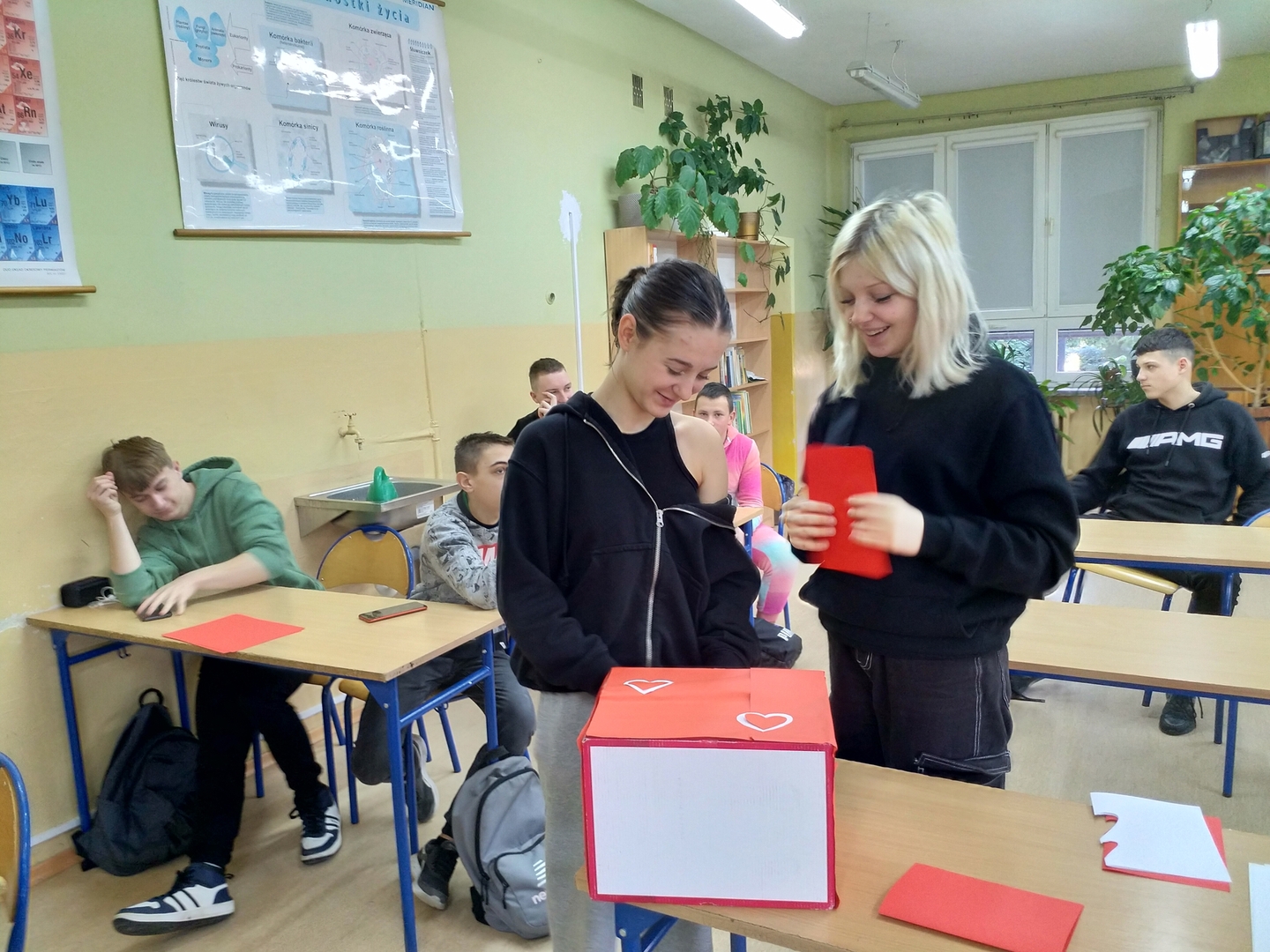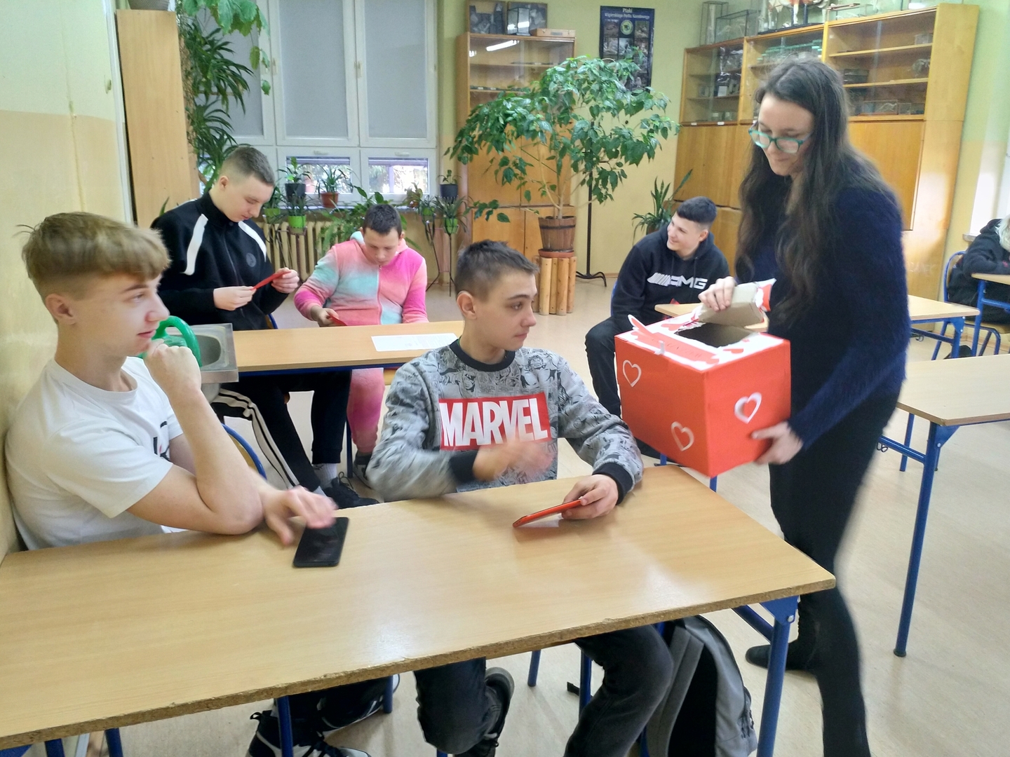 Dnia 14.02.2021 r. w naszej szkole obchodziliśmy Walentynki – wyjątkowy dzień wyrażania sympatii czy przyjaźni. Dzień ten, pomimo pandemii Covid -19 wpisał się już na stałe w harmonogram szkolnych imprez i uroczystości. Co roku staramy się, aby ten dzień był wyjątkowy. Tradycyjnie zorganizowano pocztę walentynkową. Uczniowi Branżowej Szkoły I stopnia przekazali życzenia swoim rówieśnikom. Do specjalnie przygotowanej skrzynki wrzucali własnoręcznie wykonane serduszka i kartki walentynkowe, które następnie – Walentynkowy Listonosz – rozdawał w ramach poczty walentynkowej. Niepowtarzalna atmosfera szkolnych walentynek pozostanie z pewnością na długo w pamięci wszystkich uczestników.