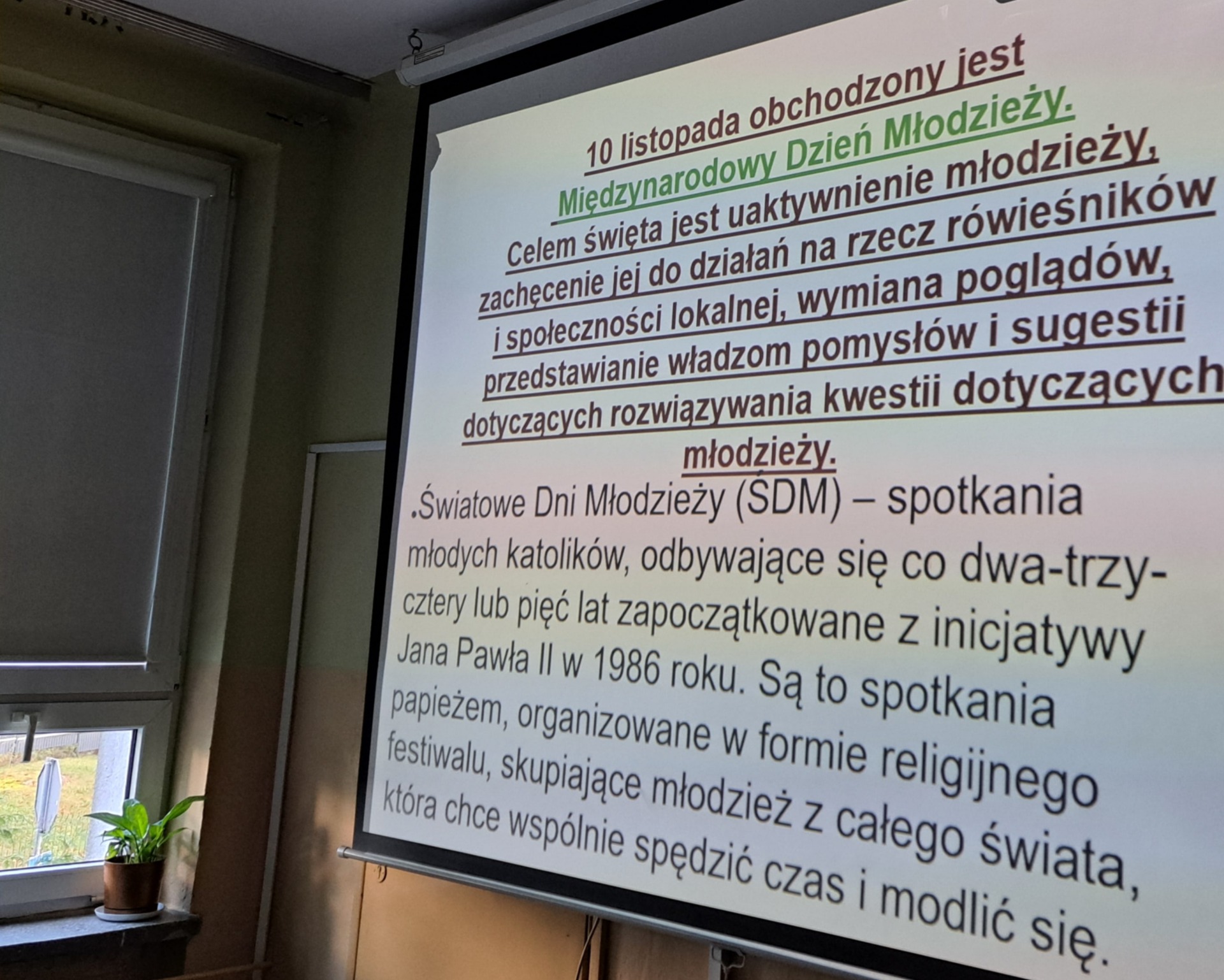 Z okazji Dnia Młodzieży przypadającego corocznie 10 listopada klasa druga Branżowej Szkoły I Stopnia przygotowała prezentację wygłoszoną podczas spotkania społeczności ZSCKU w Sulejowie. W ramach tych obchodów głośno mówi się o aktualnych trudnościach i wyzwaniach, z którymi muszą się mierzyć młodzi ludzie. JAKIE TO PROBLEMY, WYZWANIA a mianowicie między innymi kłopoty z byciem aktywnym na rynku pracy, wpływ młodzieży na możliwość globalnego rozwoju czy jakość życia nastolatków w dzisiejszych czasach, zdrowie psychiczne oraz uzależnienia różnego rodzaju i współczesne (nie)bezpieczeństwo, w tym szczególnie wobec Internetu i technologii /I.P./.